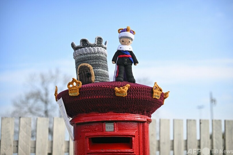 郵便ポストもおめかし? 戴冠式祝う編み物カバー