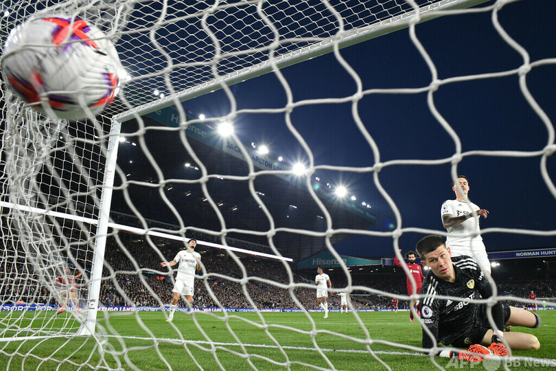 【5月2日 AFP】22-23イングランド・プレミアリーグ、リーズ・ユナイテッド(Leeds United)対リバプール(Liverpool FC)戦でリバプールのオランダ人ストライカー、コーディ・ガクポ(Cody Gakpo)が放ったシュートがゴールネットを揺らす様子を見つめるリーズ・ユナイテッドのフランス人GK、イラン・メリエ(Illan Meslier)。リーズ(Leeds)のホームスタジアム、エランド・ロード(Elland Road)で。(c)AFP