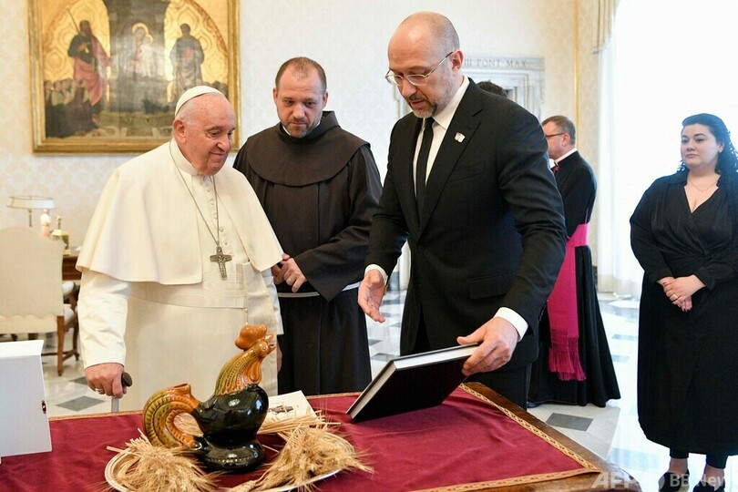 一方、ウクライナ政府は、ウクライナ人の抵抗の象徴となった陶製のオンドリの置物と、キーウ近郊ブチャ(Bucha)などでのロシア軍による残虐行為を記録した写真集をシュミハリ氏が教皇に贈ったとしている。