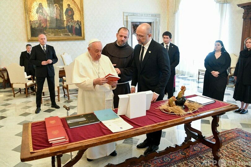 一方、ウクライナ政府は、ウクライナ人の抵抗の象徴となった陶製のオンドリの置物と、キーウ近郊ブチャ(Bucha)などでのロシア軍による残虐行為を記録した写真集をシュミハリ氏が教皇に贈ったとしている。
