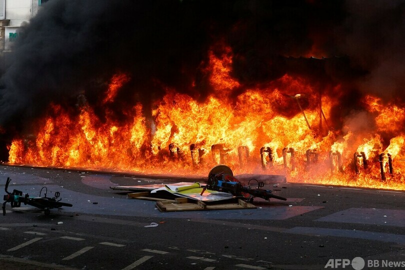AFP記者によると、パリでは一部参加者が警察に物を投げつけたり、銀行などの店舗の窓ガラスを割ったりした。警察は催涙ガスと放水銃で対応。放たれた火が建物に広がり、消防が出動する事態にもなった。