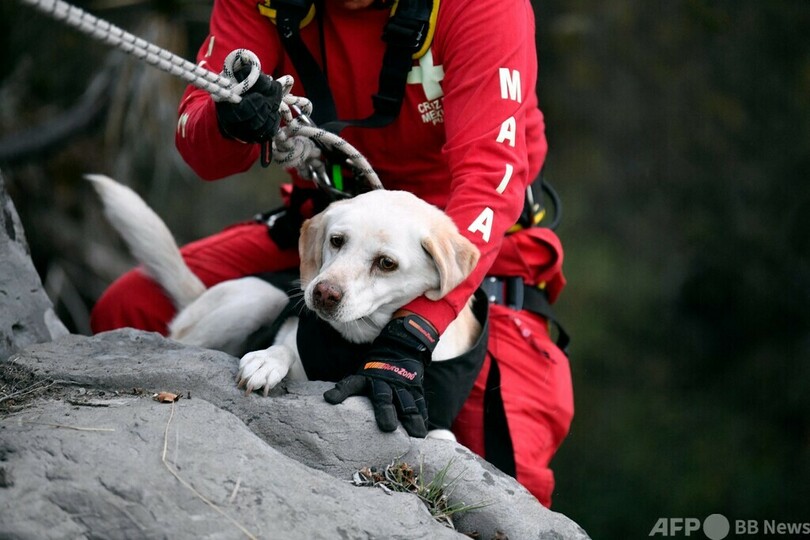 救助犬はトレーナーと一緒に渓谷を懸垂下降(アプザイレン)したり、負傷者の捜索を行ったりした。