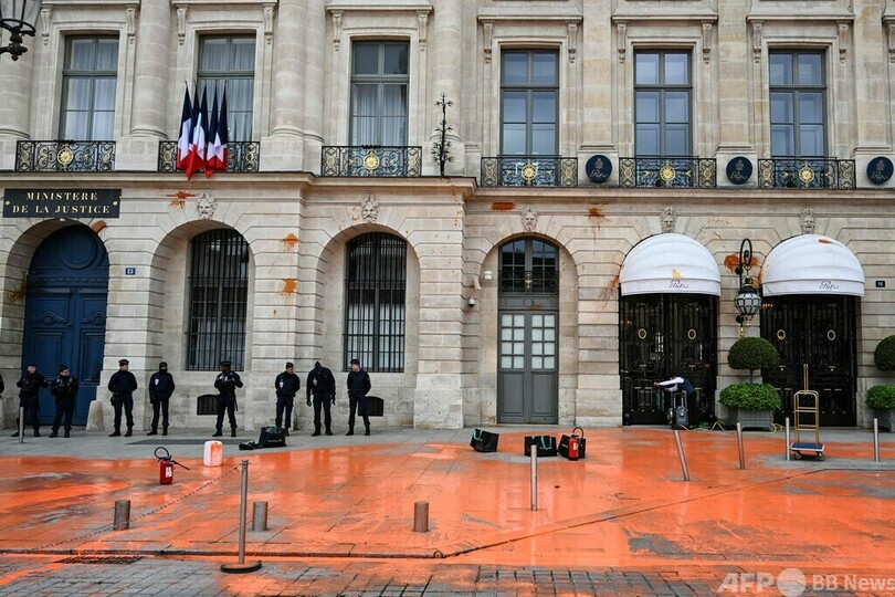 【5月2日 AFP】フランス・パリで1日、環境団体「デルニエール・レノバシオン(Derniere Renovation、最後の革新」が老舗高級ホテル・リッツ(Ritz)や隣接する司法省の前の通りにオレンジ色のペンキをまいた。