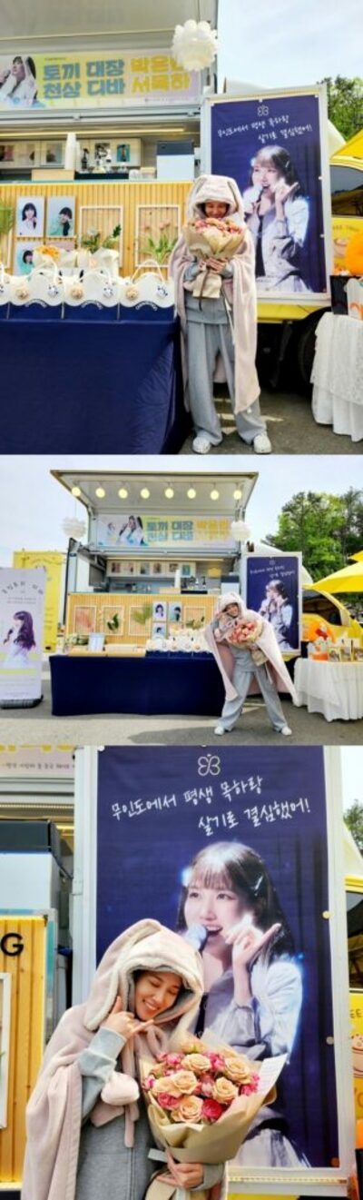 写真でパク・ウンビンは、ファンが準備したコーヒーカーの前で花束を持ってポーズを撮ったり、ウサギ形の毛布をかぶってキュートな表情を見せたりしている。