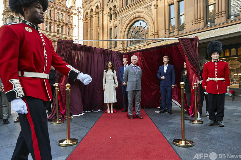 市内のクイーン・ビクトリア・ビルディング(Queen Victoria Building)で行われたお披露目式では、チャールズ国王の新人形のそばに、ウィリアム皇太子(Prince William)と妻のキャサリン皇太子妃(Catherine, Princess of Wales)、ヘンリー王子(Prince Harry)の人形も並べられた。(c)AFP