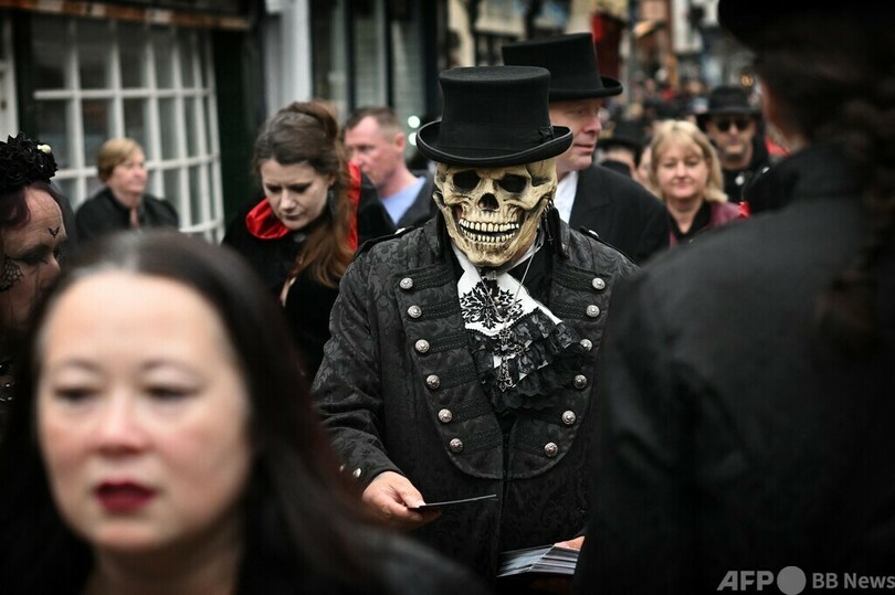 【5月11日 AFP】英イングランド北東部の海沿いの町ウィットビー(Whitby)で半年ごとに開催されるイベント「ウィットビー・ゴス・ウイークエンド(Whitby Goth Weekend)」に参加するゴスファッションの愛好家。音楽やダンス、買い物を楽しもうと国内外から数千人のゴスファンらがこのフェスに集まった。(c)AFP