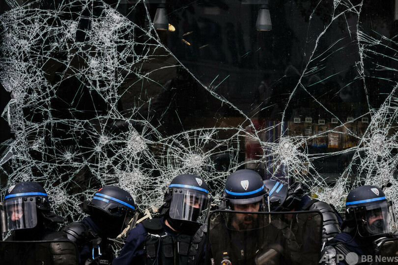 【5月13日 AFP】仏東部リヨン(Lyon)で行われたメーデーのデモへの対応で、ショーウインドーにひびが入った商店の前に立つ警察官。仏国内では3月に成立した年金改革法をめぐり、野党や労働組合が市民に抗議を続けるよう呼び掛けている。(c)AFP