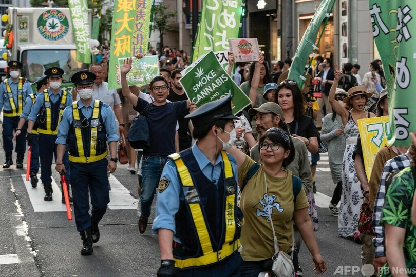 【5月6日 AFP】東京・渋谷で4日、マリフアナ(大麻)に関する規制の見直しを訴える運動「マリファナマーチ東京2023」が開催され、マリフアナのコスプレをした参加者らが行進した。