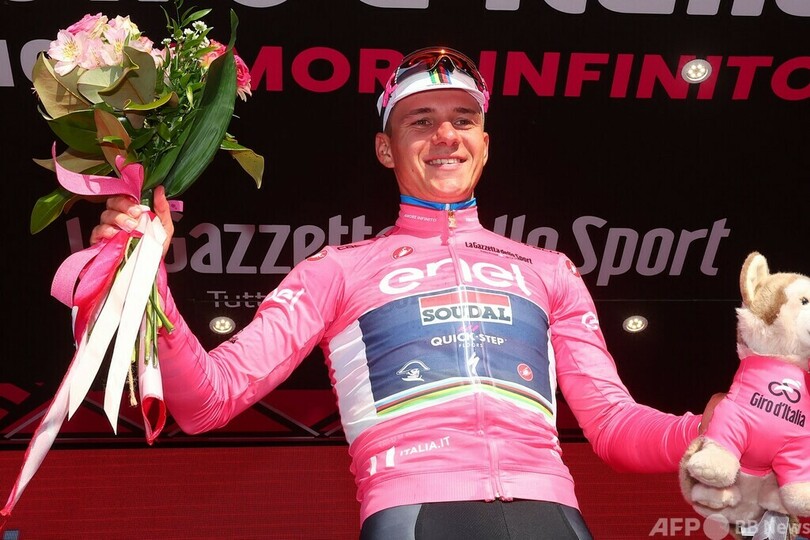 総合首位のマリアローザ(ピンクジャージー)にピンクのヘルメット、サングラスを着けて臨んだスーダル・クイックステップ(Soudal Quick-Step)のレムコ・エベネプール(Remco Evenepoel、ベルギー)は、集団の中で安全にフィニッシュし、トップを守った。