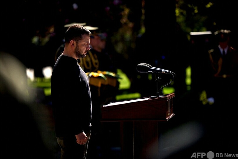 同氏は、ロシアは「侵略と併合、占領と国外追放」に加え、「大量殺人と拷問」の責任を負うと指摘し、「これらは全て、われわれの勝利、ウクライナと自由世界の勝利により報いを受けるだろう」と述べた。(c)AFP