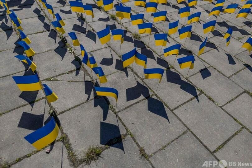 墓地の入り口では、活動家によるインスタレーション作品も展示された。多数のウクライナ国旗やロシアによる侵攻で殺害されたウクライナ人を表す十字架、ロシアの攻撃で破壊された住宅の模型などが並べられた。(c)AFP
