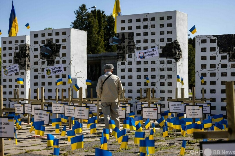墓地の入り口では、活動家によるインスタレーション作品も展示された。多数のウクライナ国旗やロシアによる侵攻で殺害されたウクライナ人を表す十字架、ロシアの攻撃で破壊された住宅の模型などが並べられた。(c)AFP