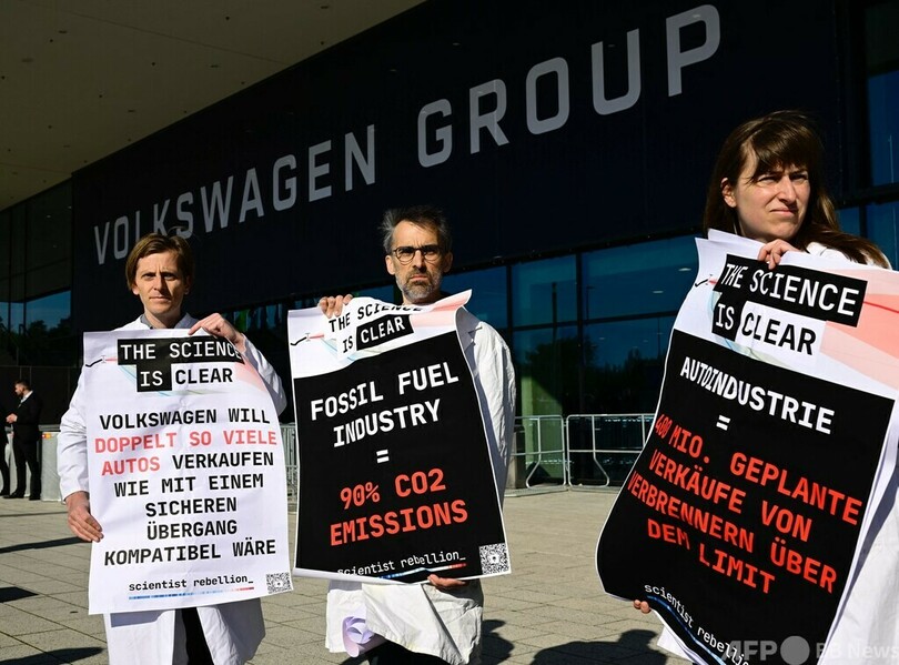 会場前にも環境活動家らが集結し、原材料調達から廃棄・リサイクルまでに排出される温室効果ガスの排出量を二酸化炭素(CO2)に換算した「カーボンフットプリント(CFP)」の削減を求めた。環境保護団体「サイエンティスト・レベリオン(Scientist Rebellion)」は「科学は明快だ。VWの自動車販売計画による(CO2)排出量は地球の限界を超えている」とのメッセージを掲げた。
