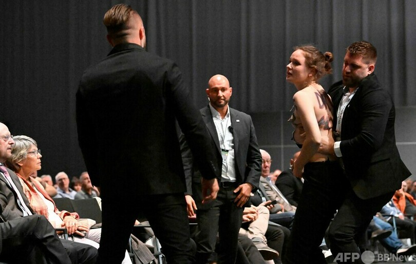独ベルリンで開かれた自動車大手フォルクスワーゲンの株主総会で、退出させられるトップレスの活動家(2023年5月10日撮影)。(c)Tobias Schwarz / AFP