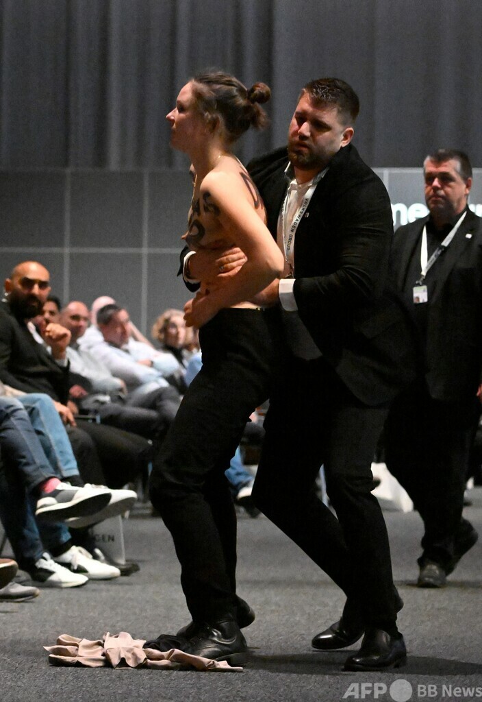 独ベルリンで開かれた自動車大手フォルクスワーゲンの株主総会で、退出させられるトップレスの活動家(2023年5月10日撮影)。(c)Tobias Schwarz / AFP