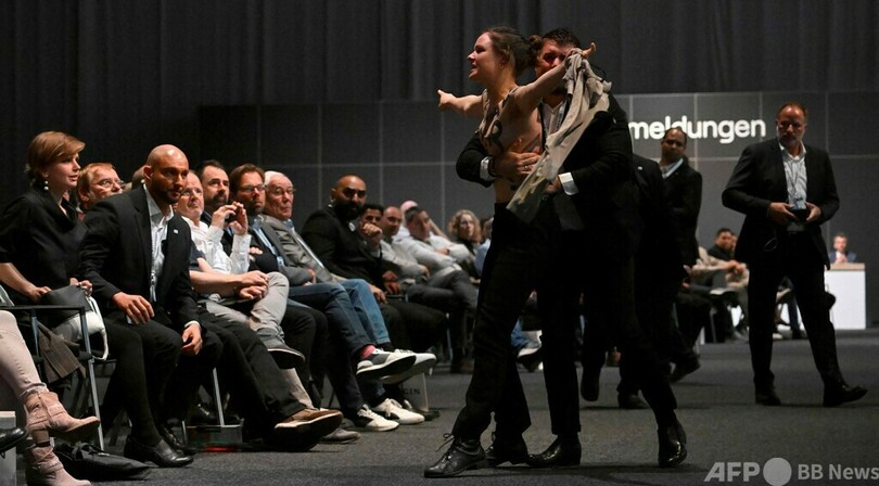 独ベルリンで開かれた自動車大手フォルクスワーゲンの株主総会で、退出させられるトップレスの活動家(2023年5月10日撮影)。(c)Tobias Schwarz / AFP