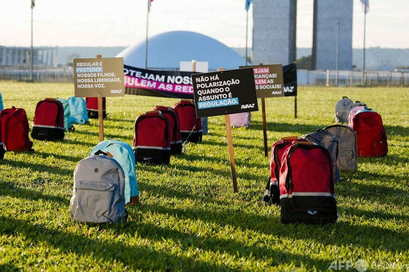 【5月16日 AFP】ブラジル・ブラジリアの国会前で、相次ぐ学校襲撃事件の犠牲者を表したリュックサックが並べられた。国際的な政策提言NGO「アバーズ(Avaaz)」によるもので、ソーシャルメディアを取り締まる法規制の欠如を非難している。(c)AFP