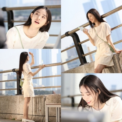 写真で、シン・シアは屋外の和気あいあいとした撮影現場で明るい笑顔を見せている。また、青い海を背景にさわやかなムードを醸し出している。