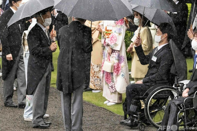 皇族方と共に出席された両陛下は、元車いすテニス選手の国枝慎吾(Shingo Kunieda)さんや、東京パラリンピック競泳で金メダルを獲得した木村敬一(Keichi Kimura)さんら招待客と懇談された。(c)AFP