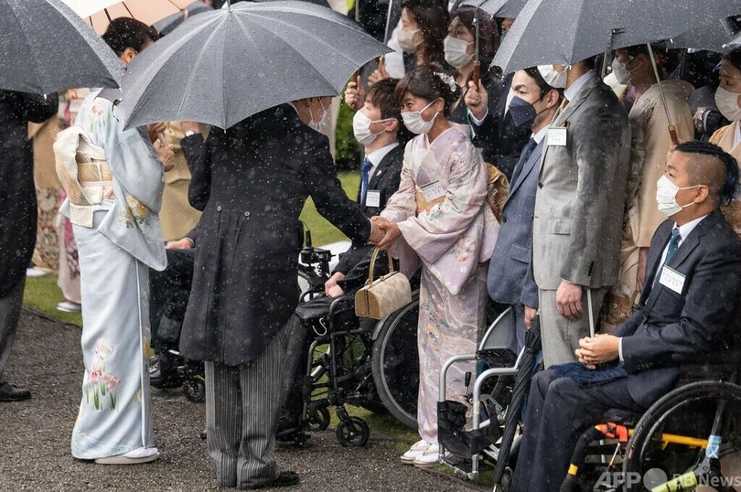 皇族方と共に出席された両陛下は、元車いすテニス選手の国枝慎吾(Shingo Kunieda)さんや、東京パラリンピック競泳で金メダルを獲得した木村敬一(Keichi Kimura)さんら招待客と懇談された。(c)AFP