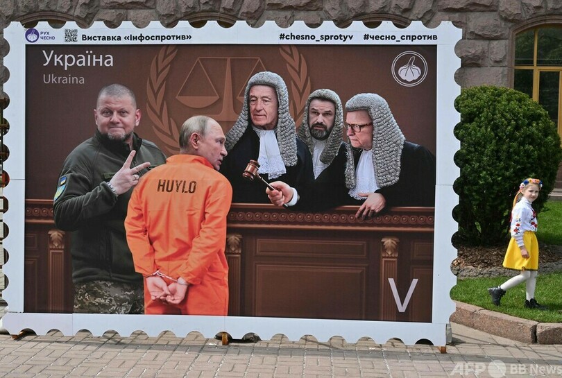 【5月12日 AFP】ウクライナの首都キーウ中心部に、後ろ手に手錠を掛けられたロシアのウラジーミル・プーチン(Vladimir Putin)大統領がオランダ・ハーグ(The Hague)の国際刑事裁判所(ICC)に出廷しているように見える合成画像のパネルが登場した。