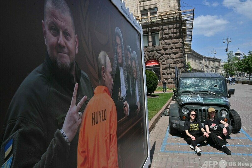 プーチン氏の横では、ウクライナ軍のワレリー・ザルジニー(Valeriy Zaluzhny)総司令官がVサインをしている。少し離れた場所に止められた軍用車両の割れたフロントガラスの穴からパネルを見られるようになっている。