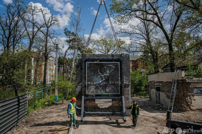 【5月14日 AFP】ウクライナの首都近郊イルピン(Irpin)で13日、英国の覆面ストリートアーティスト、バンクシー(Banksy)のグラフィティ作品が、大きく損壊した建物から壁ごと取り外された。