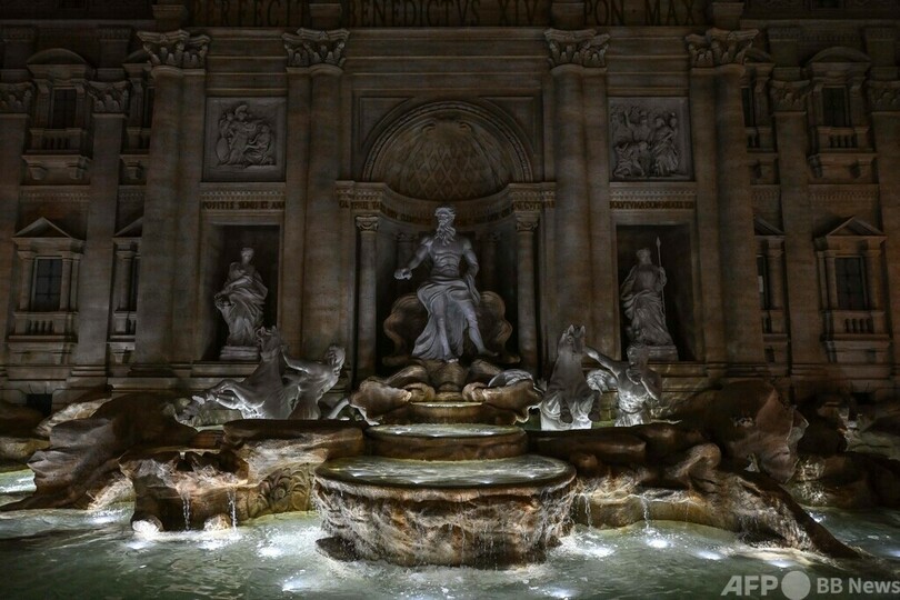 レプリカは32万ドル(約4300万円)相当をかけて造られた。高さは11メートル、幅は20.7メートルで、大きさはイタリア・ローマの本物のトレビの泉の4割程度。16万リットルの水が使われている。(c)AFP