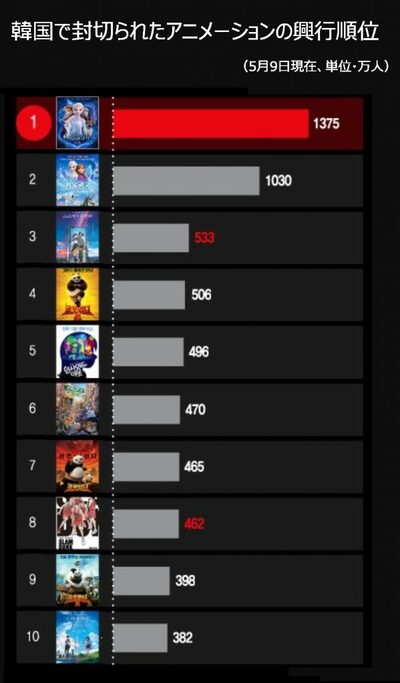 アニメーション興行5位はディズニー・ピクサーの「インサイド・アウト」、6位はディズニーの「ズートピア」が占めた。7位に「カンフーパンダ」、9位に「カンフーパンダ3」が上がり、「カンフーパンダ」シリーズに厚い韓国ファン層があることをうかがわせる。