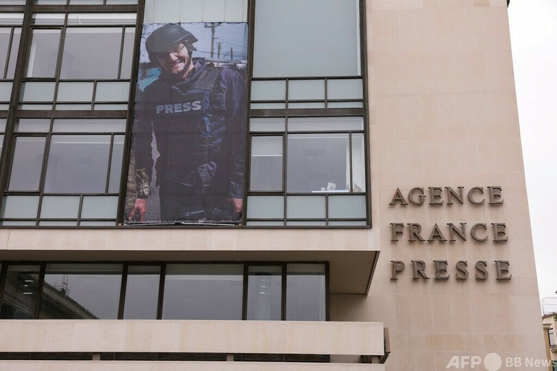 【5月19日 AFP】フランス・パリにあるAFP通信社(Agence France Presse)本社ビルの正面に掲げられた同社ジャーナリストのアルマン・ソルディン(Arman Soldin)氏の写真。ソルディン氏は9日、AFP取材班の一員としてウクライナ東部チャシウヤール(Chasiv Yar)で取材中、ロケット砲による攻撃を受け死亡した。ソルディン氏はボスニア生まれの32歳、昨年9月からビデオコーディネーターとしてキーウに駐在していた。(c)AFP