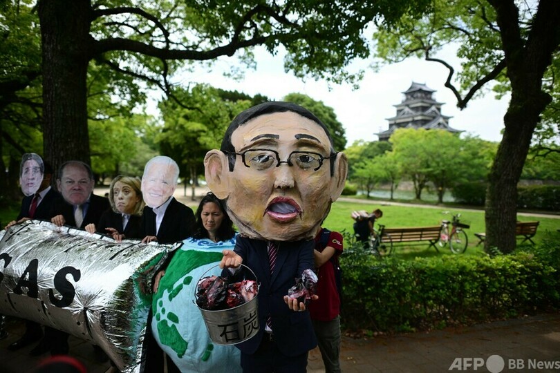 【5月18日 AFP】広島県広島市で18日、先進7か国(G7)首脳会議(サミット)を前に環境活動家らが「日本の汚いエネルギー政策」に抗議するデモを行った。
