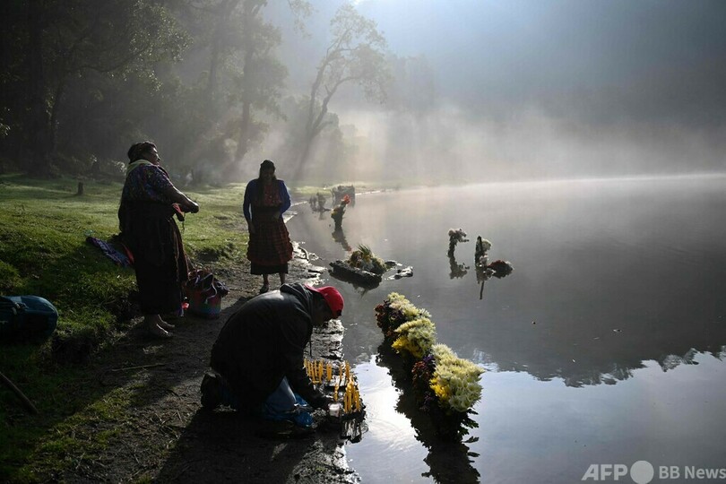 マヤ人が火口湖畔で儀式、豊作祈願 グアテマラ