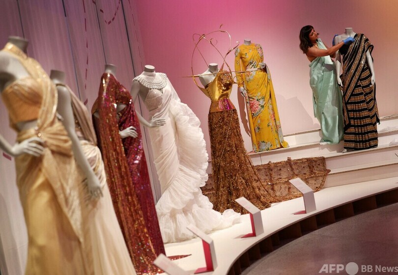 展覧会では、インドのデリーやムンバイ(旧ボンベイ)で通勤中の若い女性が着用するものから、米ニューヨークで開催されるファッションの祭典「メット・ガラ(Met Gala)」に登場した華やかなデザインまで、21世紀に復活を遂げたサリーが取り上げられている。