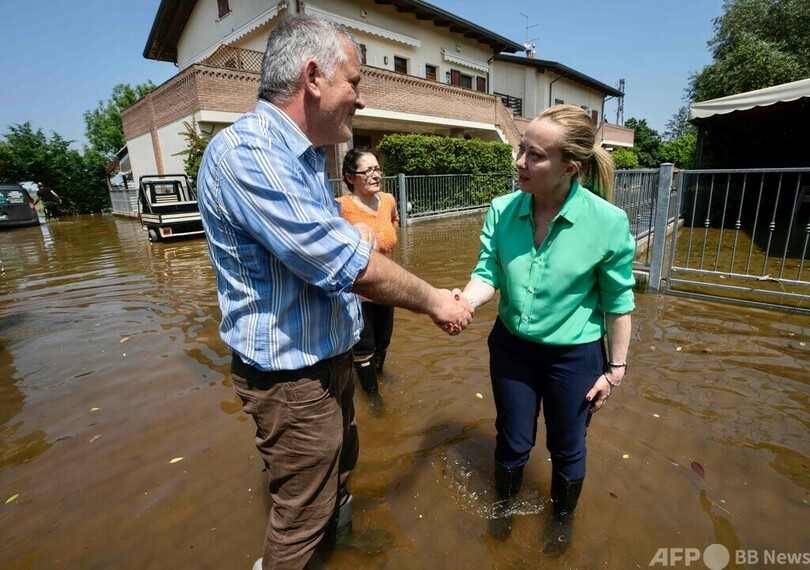 メローニ氏は、被災者やボランティアと握手したり、言葉を交わしたりした。国営イタリア放送協会(RAI)の映像には、住まいを失った人々に食料を提供している住民に「素晴らしい行いだ」と声を掛ける様子も捉えられている。