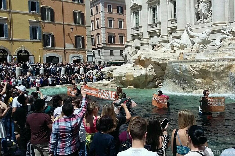 伊トレビの泉、黒に染まる 環境団体が抗議行動