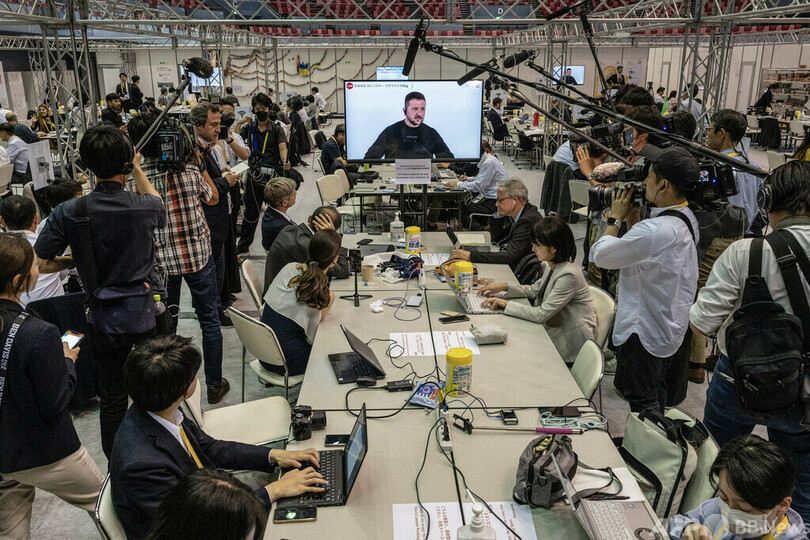 【5月28日 AFP】広島市で開催された先進7か国(G7)首脳会議(サミット)の国際メディアセンターで、ウクライナのウォロディミル・ゼレンスキー(Volodymyr Zelensky)大統領の記者会見が映し出されたテレビ画面の周りに集まる報道陣。(c)AFP