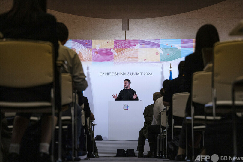 【5月28日 AFP】広島市で開催された先進7か国(G7)首脳会議(サミット)の国際メディアセンターで、ウクライナのウォロディミル・ゼレンスキー(Volodymyr Zelensky)大統領の記者会見が映し出されたテレビ画面の周りに集まる報道陣。(c)AFP