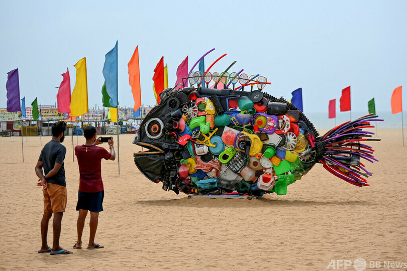 【6月3日 AFP】インド・チェンナイ(Chennai)で開催される主要20か国・地域(G20)の会合を前に、啓発の一環としてエドワード・エリオット・ビーチ(Edward Elliot's Beach)に展示されたプラスチックゴミでできた魚のインスタレーション。(c)AFP