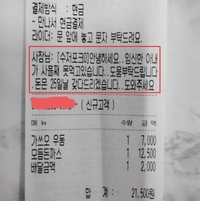 Bさんは「妊娠した妻が飢えている」と同情を求めた。「こんにちは。妊娠した妻が3日間も食べられずにいます。どうか助けてください。お金は25日に持って行きます。助けてください」と、うどんとトンカツの盛り合わせを注文した。