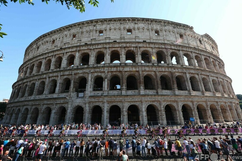 ジロでは区間17勝目、三大ツール(グランツール)通算では54勝目を挙げたカヴェンディッシュは、「本当にうれしい。長く険しい道のりを経て、ジロの終点にたどり着くことができた。これまでも惜しかったことは何度かあったが、このローマで勝てて最高だ。コロッセオの外で勝ちたいと以前から思っていた」と喜んだ。(c)AFP/Terry DALEY