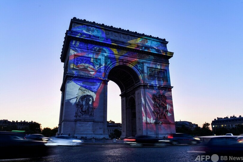 大会はこの日で開幕まで100日を迎え、パリの凱旋(がいせん)門(Arc de Triomphe)には記念のプロジェクションマッピングが投影された。(c)AFP