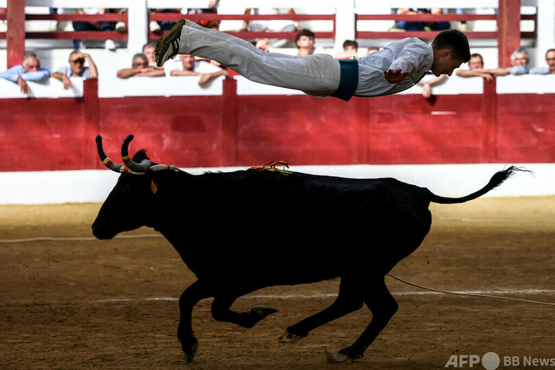 【6月13日 AFP】フランス南西部サマデ(Samadet)で開かれた伝統行事「クルス・ランデーズ(Course Landaise)」で、雄牛の上を飛び越えるジャンパー。同行事は毎年5月から10月にかけて開催される催しで、出場する男性は雄牛と接触しないようにジャンプしたり素早く避けたりしなければならない。(c)AFP