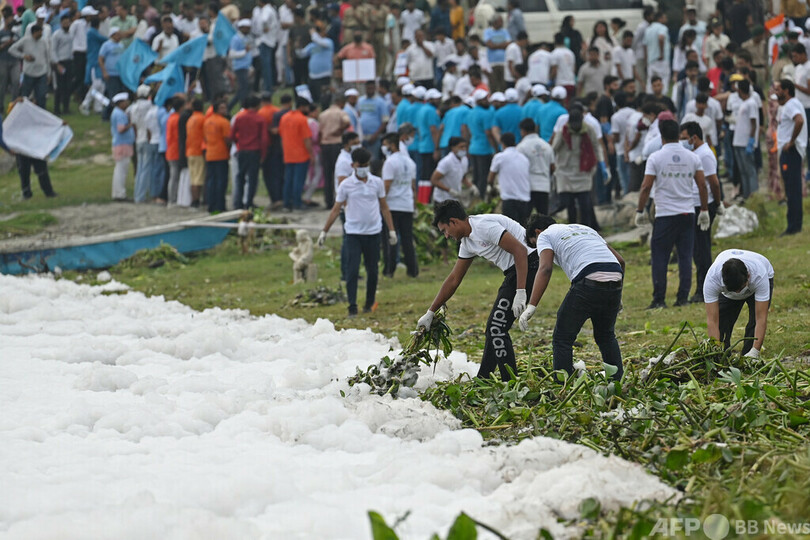 泡で覆われた「神聖な川」 印で清掃活動、世界環境デー