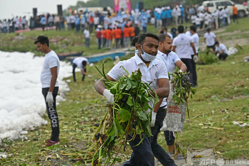 泡で覆われた「神聖な川」 印で清掃活動、世界環境デー