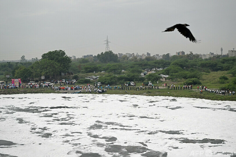 泡で覆われた「神聖な川」 印で清掃活動、世界環境デー