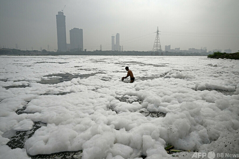泡で覆われた「神聖な川」 印で清掃活動、世界環境デー