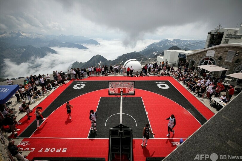 【7月12日 AFP】フランス南西部ラモンジー(La Mongie)にあるピク・デュ・ミディ(Pic du Midi)の山頂で、3x3バスケットボールのエキシビションマッチを披露する女子チームの選手ら。(c)AFP