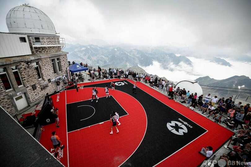 【7月12日 AFP】フランス南西部ラモンジー(La Mongie)にあるピク・デュ・ミディ(Pic du Midi)の山頂で、3x3バスケットボールのエキシビションマッチを披露する女子チームの選手ら。(c)AFP