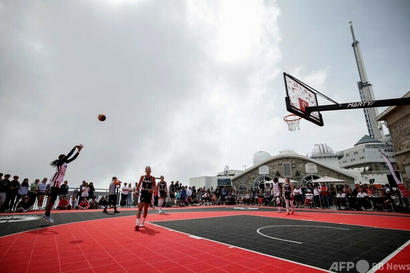 【7月12日 AFP】フランス南西部ラモンジー(La Mongie)にあるピク・デュ・ミディ(Pic du Midi)の山頂で、3x3バスケットボールのエキシビションマッチを披露する女子チームの選手ら。(c)AFP