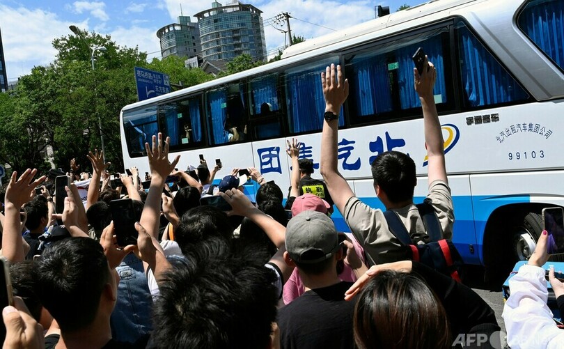また他の数百人の人々は、同市内を流れる亮馬河(Liangma River)近くにあるチームの滞在するホテルに詰めかけた。